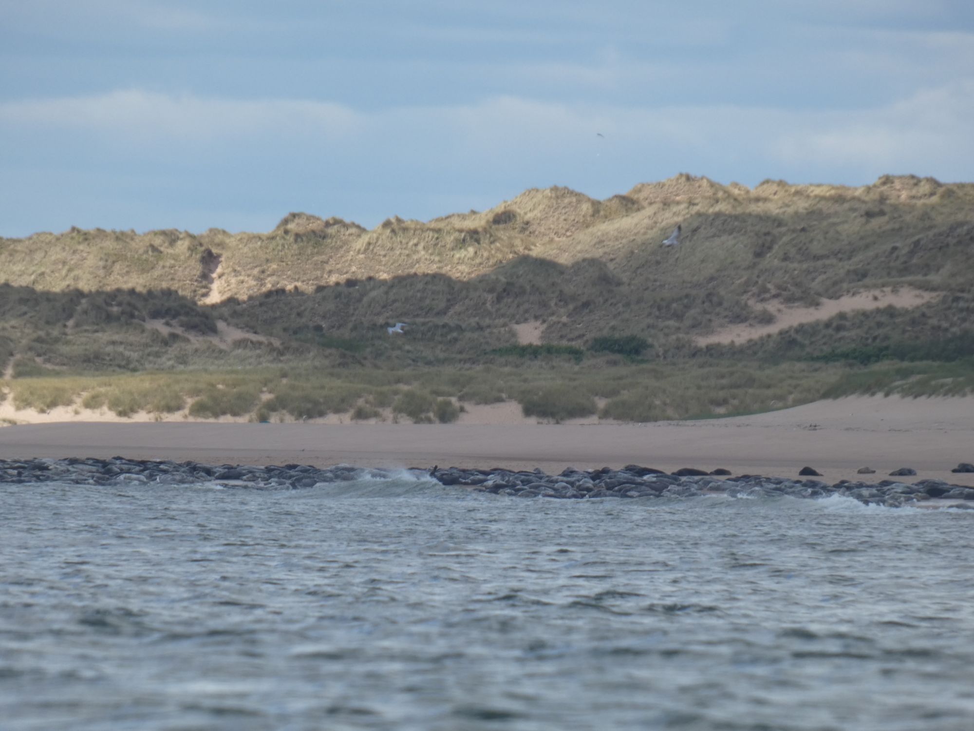 The next 20+ kilometres to Aberdeen was one long stretch of dunes and beach. I kept well clear of the seals at their expected place as it wouldn’t do to initiate a mass exodus. Seals are often curious about kayaks when in the water, but see them as a threat when resting ashore. More so than with other larger boats. I’m not sure if my paddle, one that takes inspiration from the Inuit original, would also add to their unease. Over the next few kilometres, I heard the frequent splashes of seals behind me as they approached close and then darted away underwater.